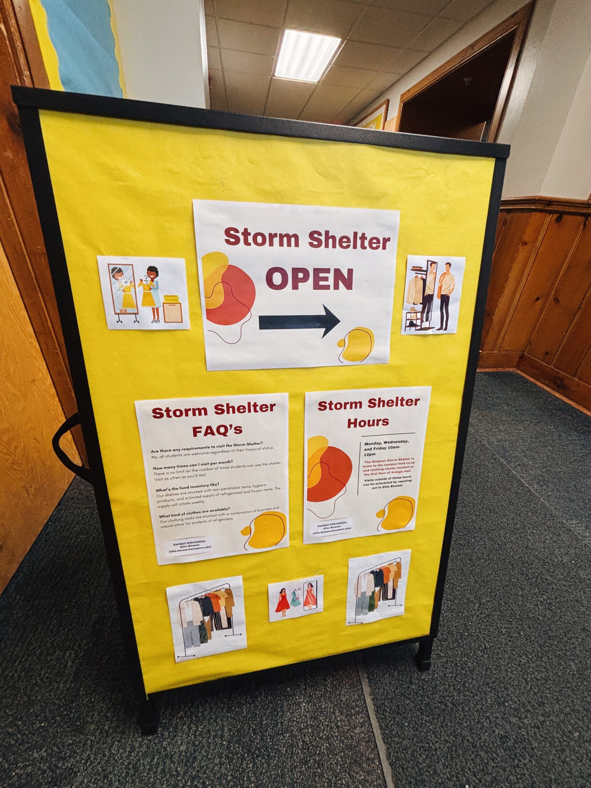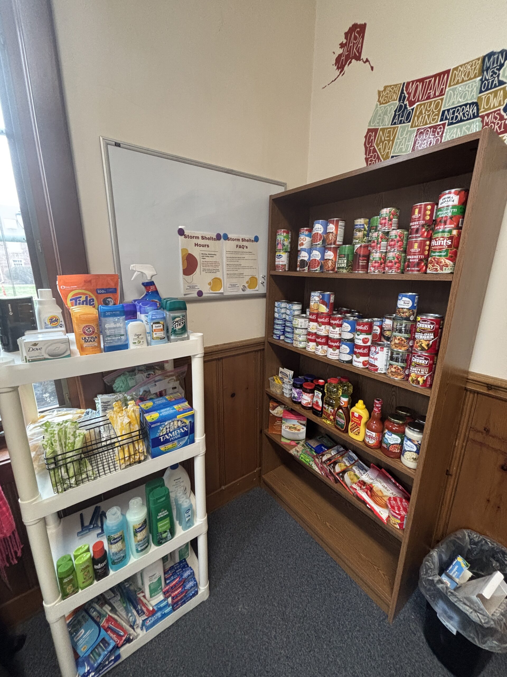 The Simpson Storm Shelter is home to the campus food co-op and clothing closet, located on the first floor of Kresge Hall. The hours of operation are Monday, Wednesday and Friday from 10am-12pm. Visits outside of these hours can be scheduled by reaching out to Ellie Blosser, AmeriCorps Service & Community Engagement Coordinator, via email ellie.blosser@simpson.edu.