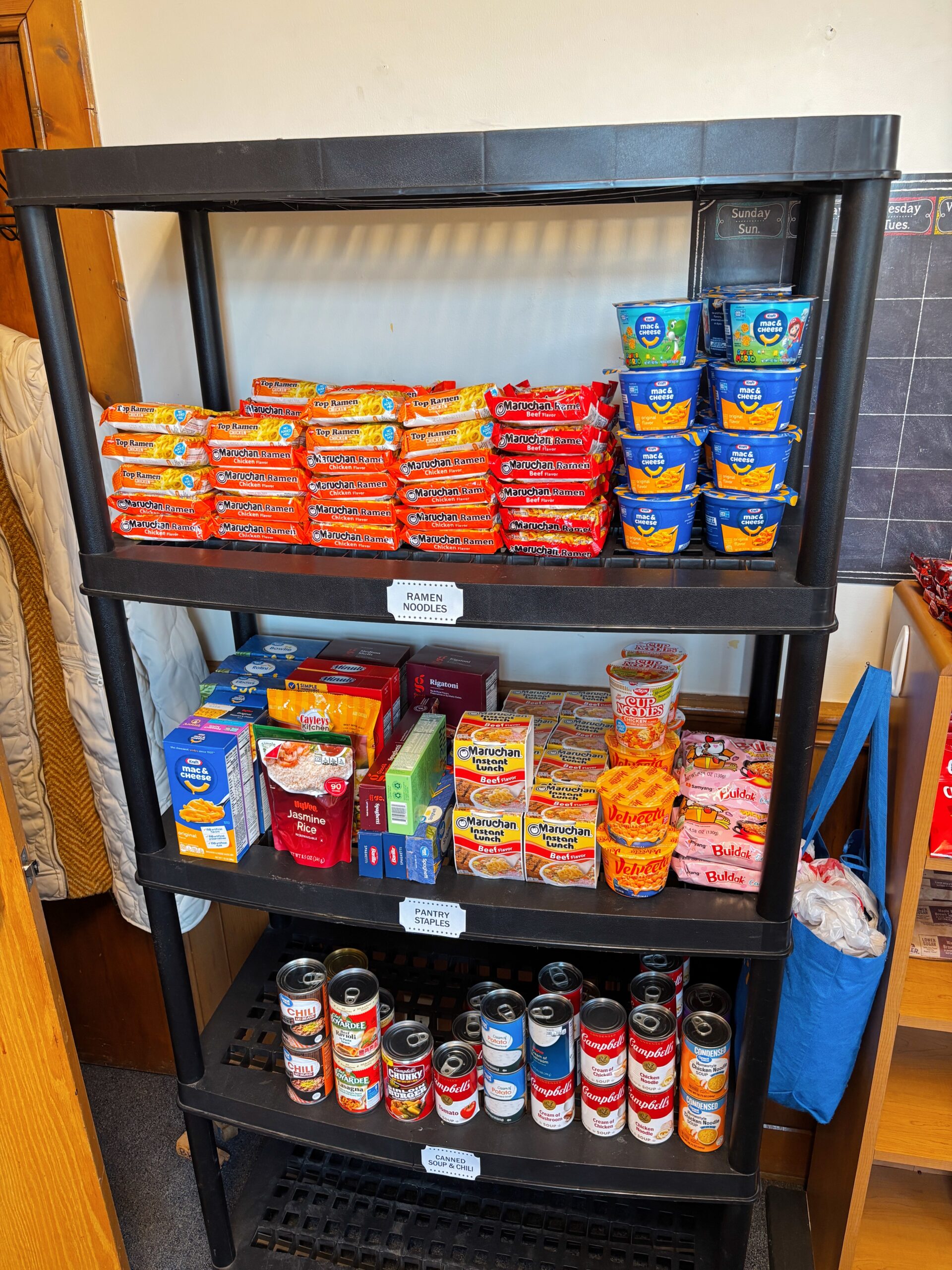 - Our shelves are stocked with non-perishable items, hygiene products, and a limited supply of refrigerated and frozen items. The supply will rotate weekly.
