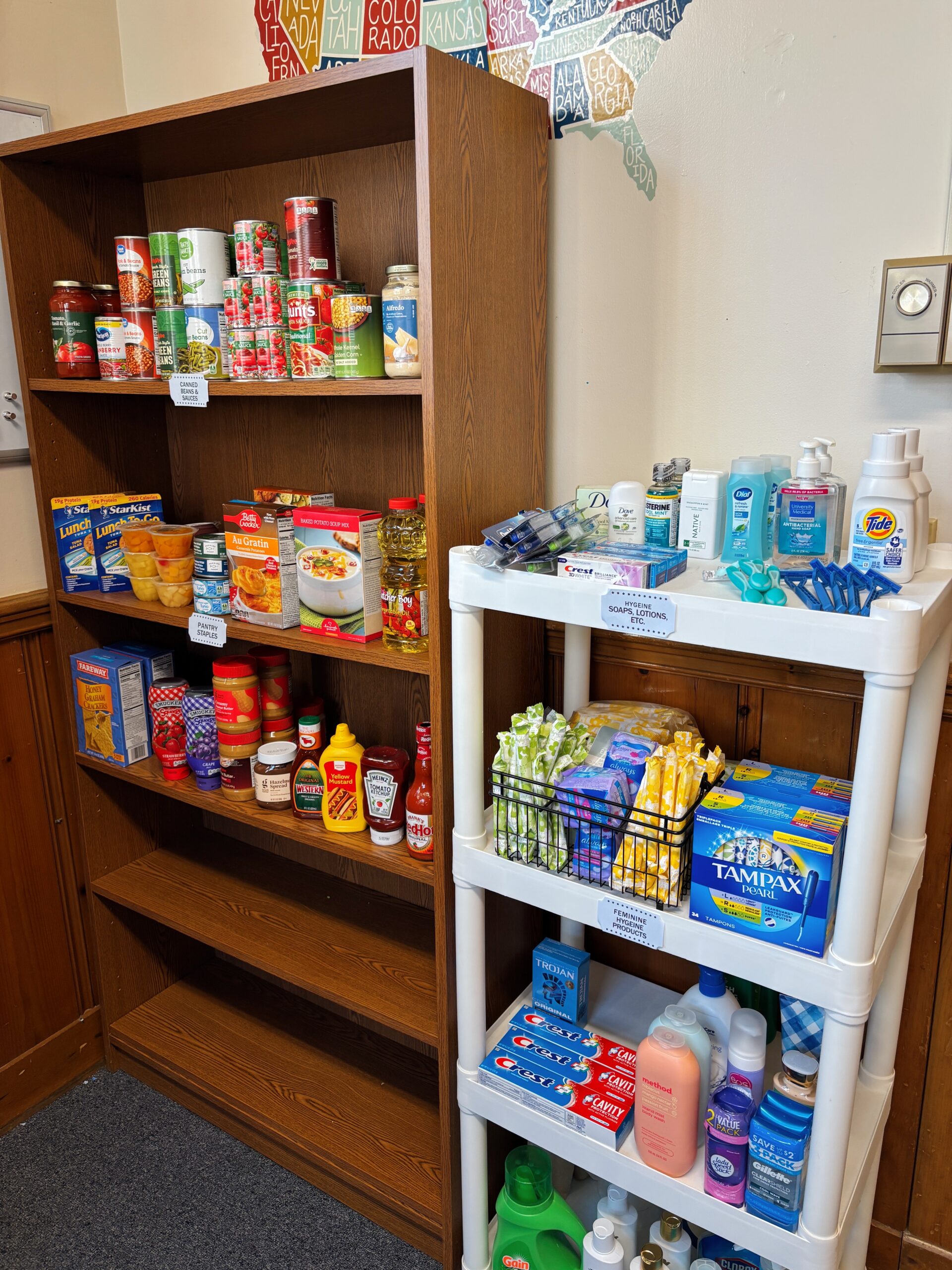 The Storm Shelter is available for all students to utilize, and their student ID will let them into Kresge Hall. Food co-op items include non-perishable food items, hygiene products, and a limited supply of refrigerated and frozen items. Clothing closet items include a combination of business and casual attire for students of all genders. All donations are sorted throughout the week to best meet the needs of our students.