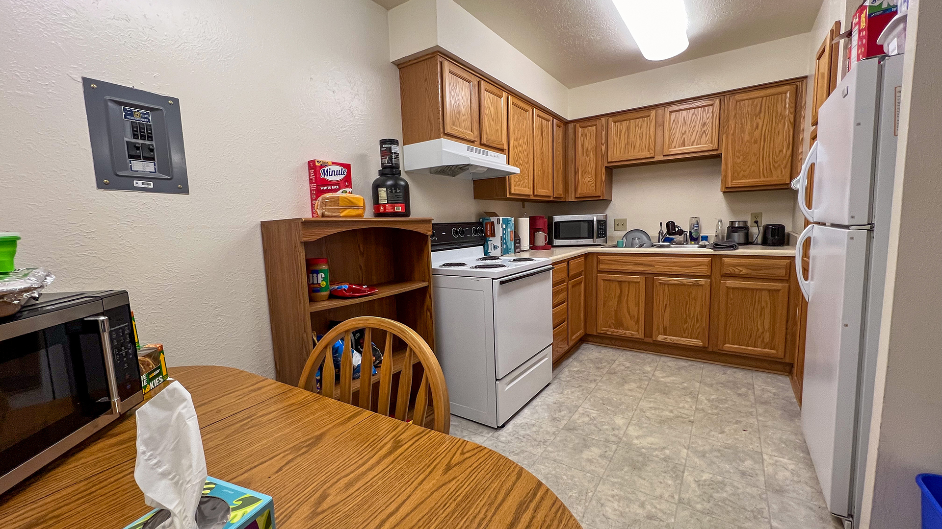 The Colonial Apartments are located at 504 North Buxton Street — directly across from the Amy Robertson Music Center and next door to Washington Apartments. This building houses two to four upper division students per apartment in 14 one- and two-bedroom units. Each apartment has one bathroom.