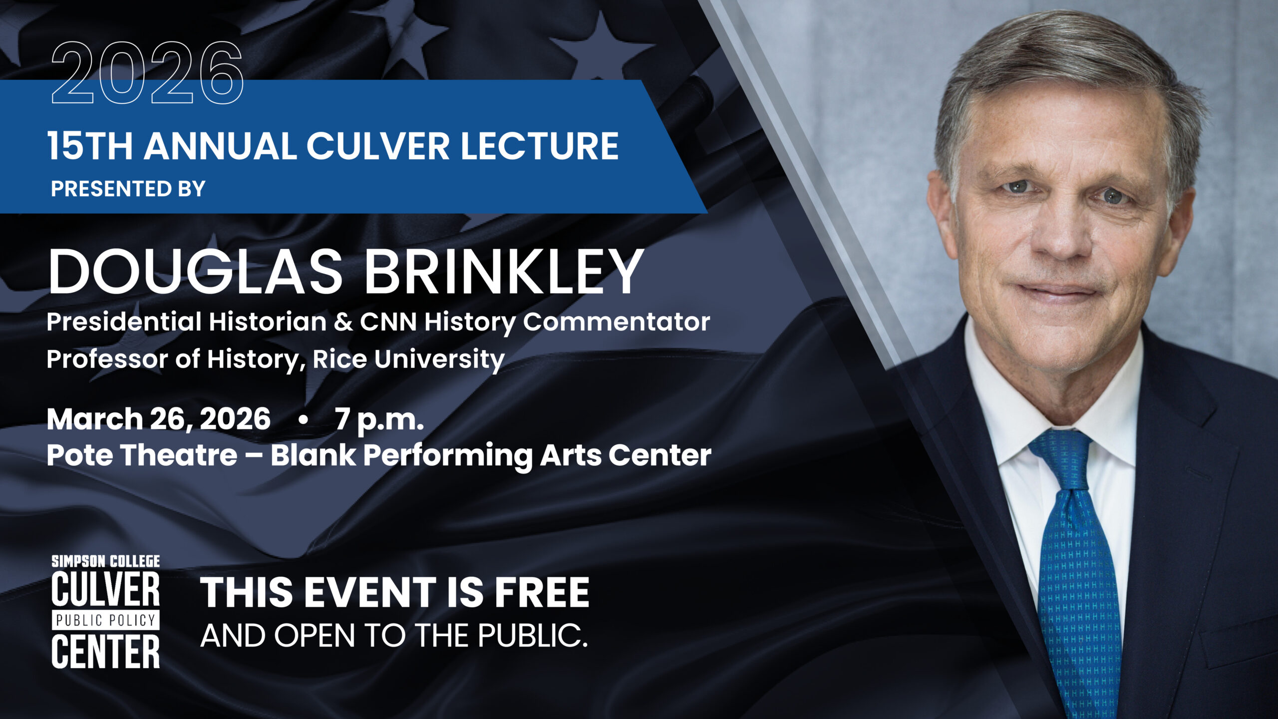 The Culver Lecture is one of many Simpson events being presented to celebrate the 250th anniversary of the founding of the United States in 1776. Throughout 2026, Simpson will commemorate America 250 through a series of major lectures, panel discussions, and student-led initiatives to bring American history to life.