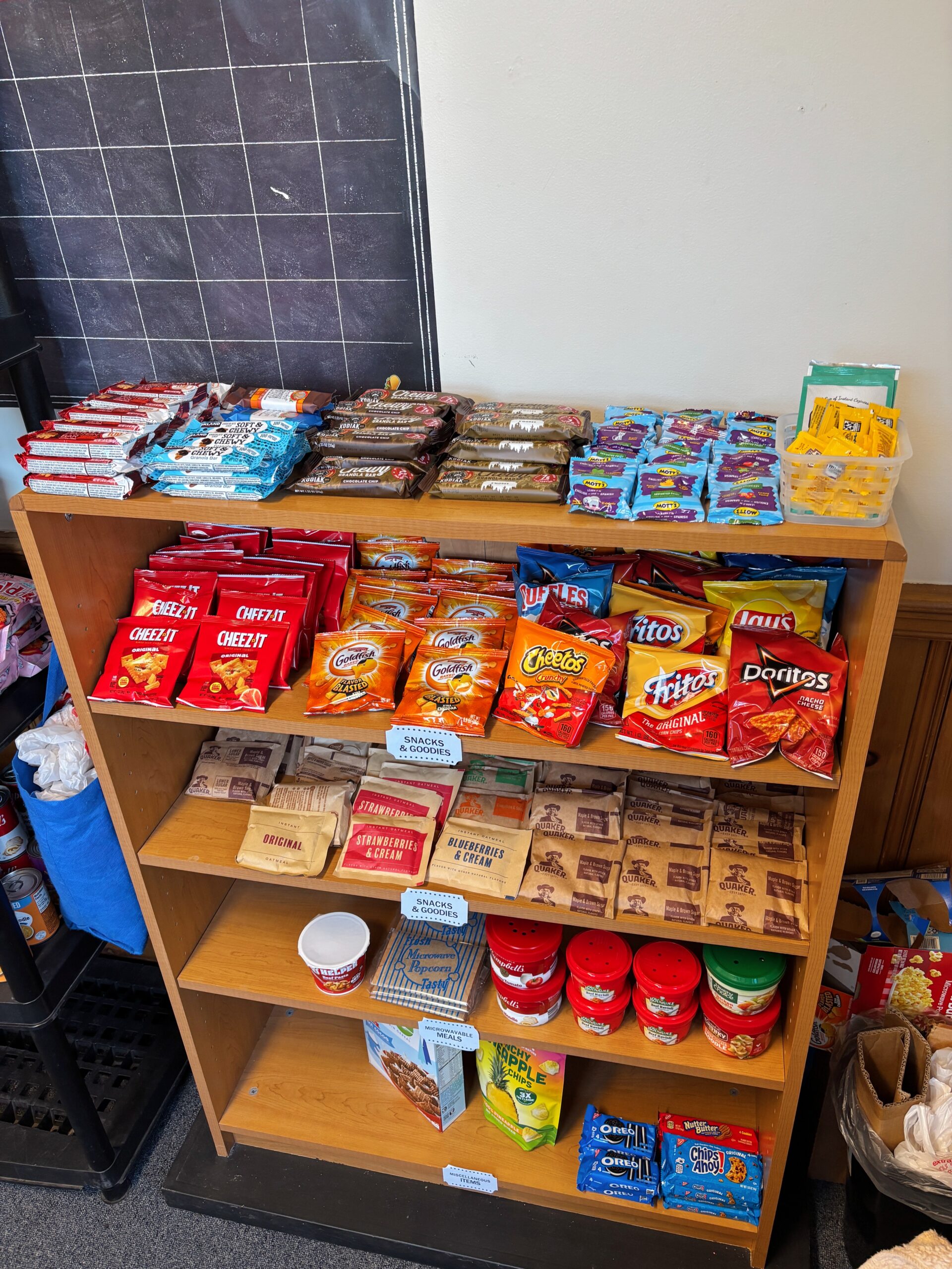 - Our shelves are stocked with non-perishable items, hygiene products, and a limited supply of refrigerated and frozen items. The supply will rotate weekly.