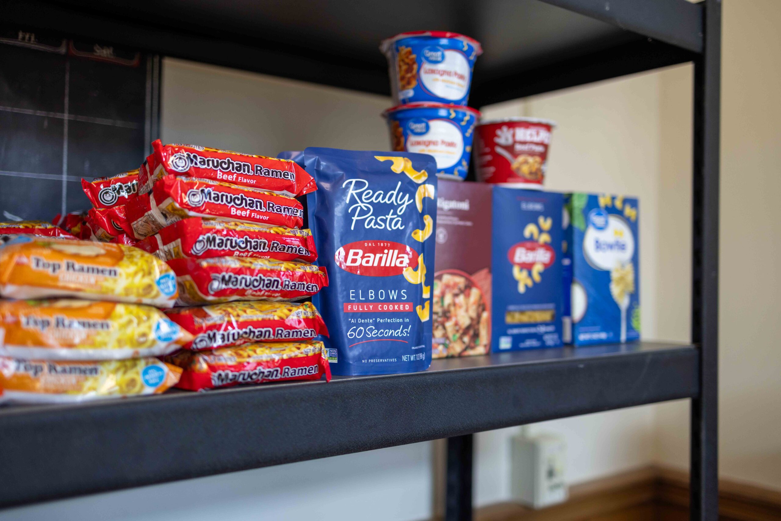 Ramen, Pasta, Rice, Peanut Butter, Condiments/Sauces, Canned Protein (Tuna & Chicken), Fruit Snacks/Fruit Cups/Fruit Pouches, Snack-Size Chips & Crackers, Ravioli & Soup, Vegetable Oil, Sugar, Flour, Hand Soap/Bar Soap/Body Wash, Shampoo/Conditioner, Liquid Laundry Detergent (No Pods), Stain Remover, Toothbrushes, Deodorant, Tissues
